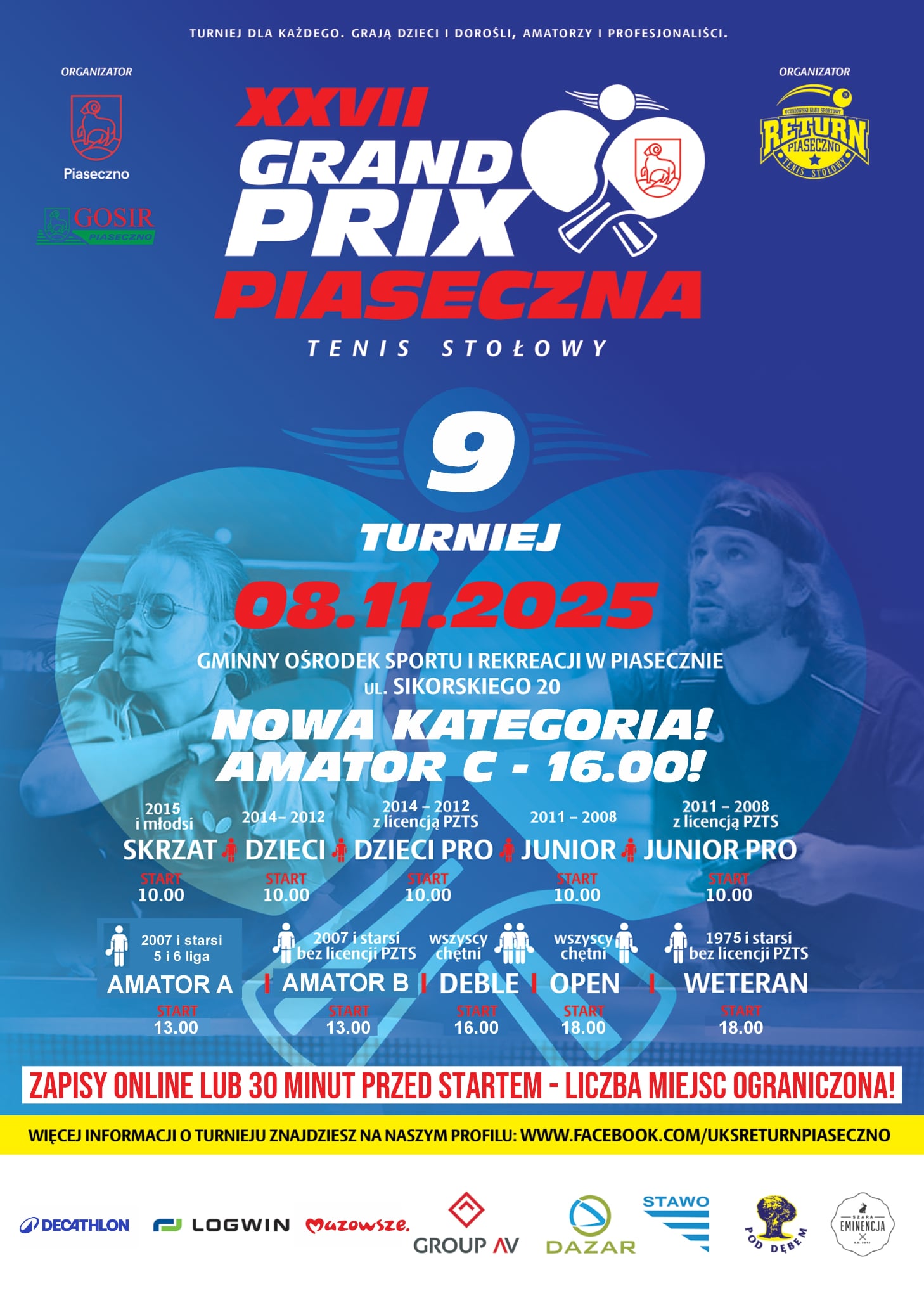 Zapisy DOROŚLI - Grand Prix Piaseczna w tenisie stołowym - kategorie dla dorosłych, 08.11.2025 | Decathlon Go