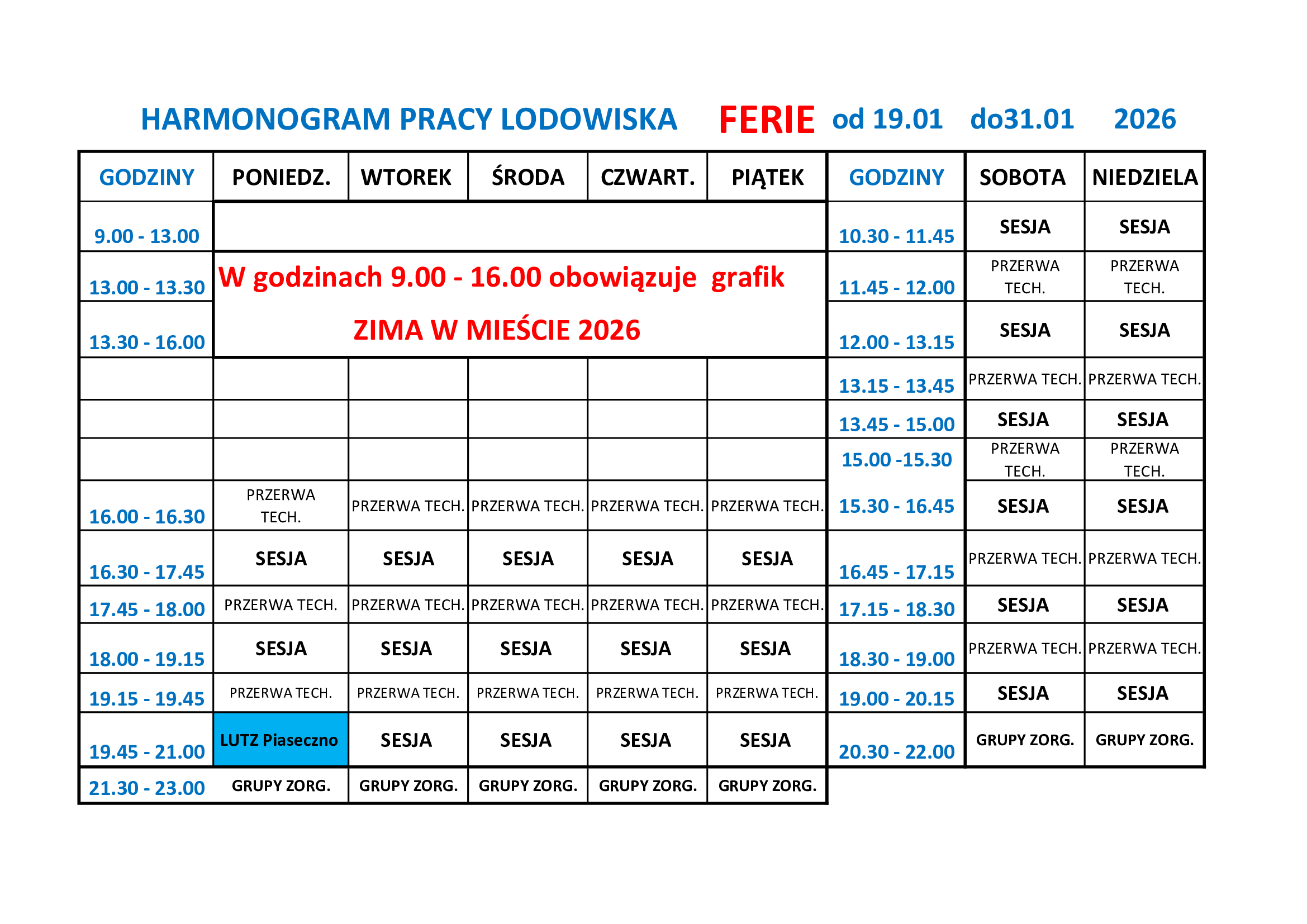 Poniżej zamieszczamy harmonogram pracy Lodowiska w okresie ferii zimowych. Serdecznie zapraszamy.