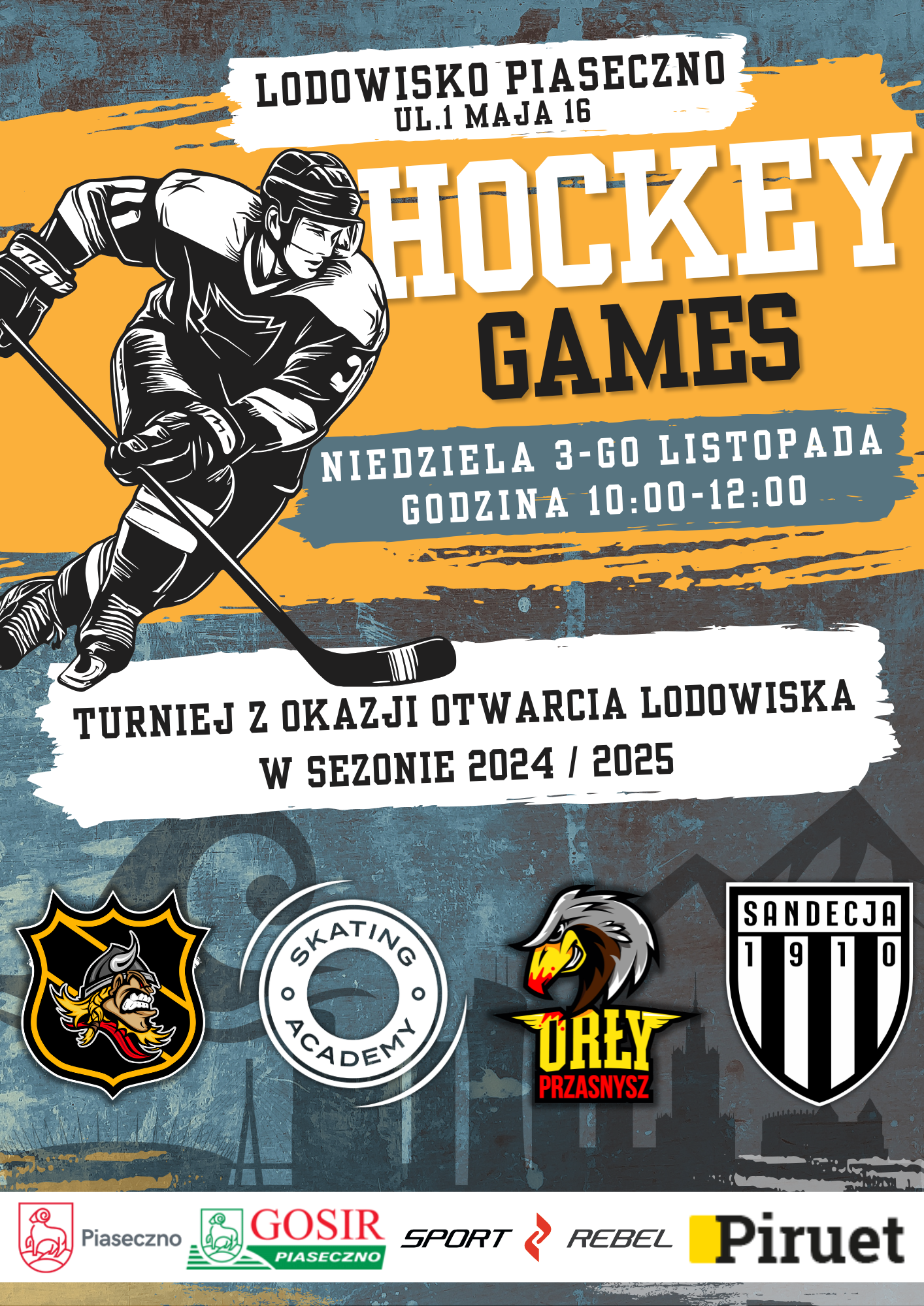 Zapraszamy na rozpoczęcie sezonu zimowego na lodowisku w Piasecznie. W najbliższą niedzielę 3 listopada w ramach inauguracji odbędzie się turniej w hokeju na lodzie, w którym wystartują 4 drużyny, w tym ekipa Skating Academy z Piaseczna. Turniej trwa od godziny 10:00 do 12:00