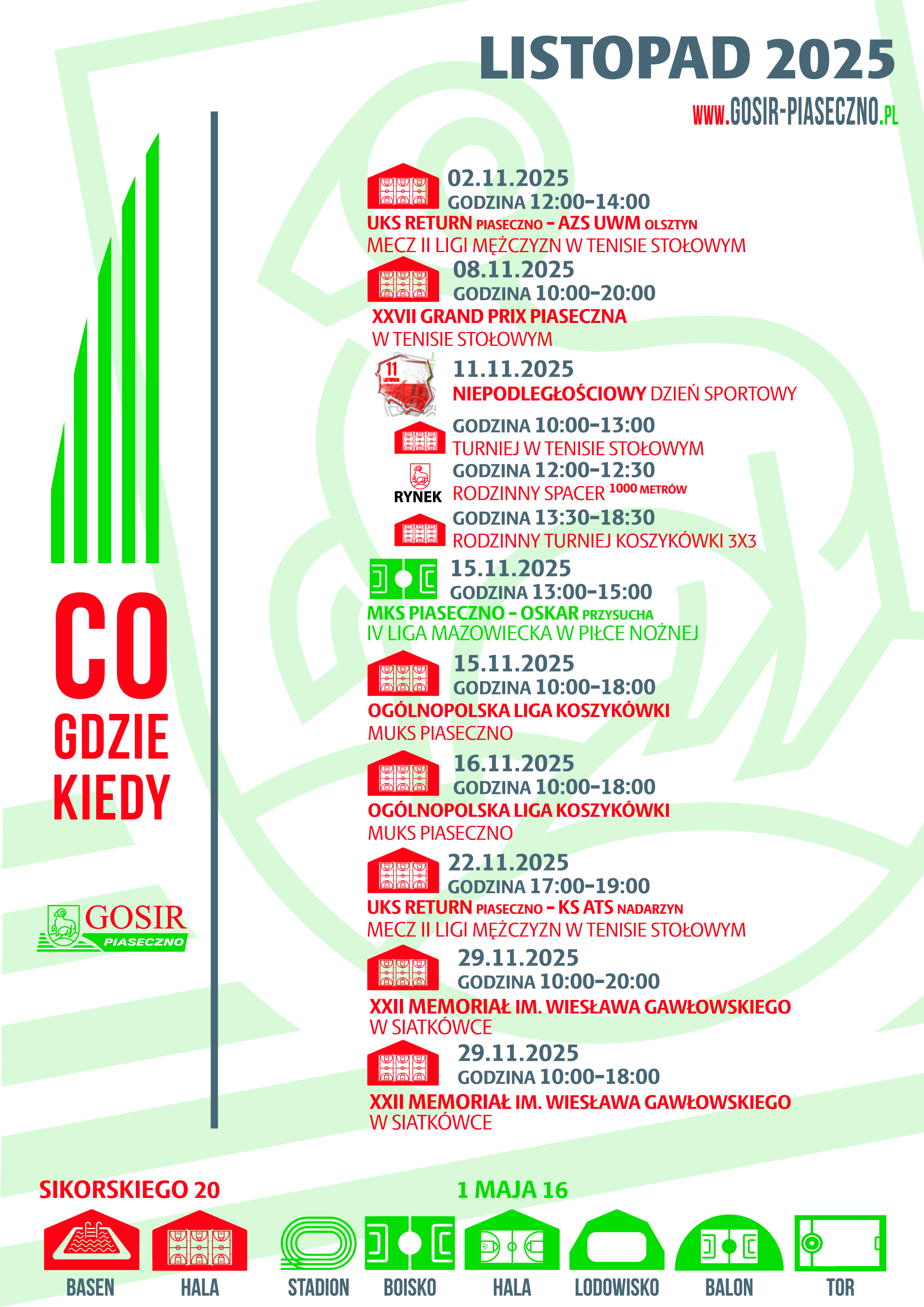 2. Niepodległościowy Turniej Tenisa Stołowego - start o godzinie 10:00, miejsce: Hala GOSiR Piaseczno (ul. Sikorskiego 20). Turniej tenisa stołowego dla dzieci i dorosłych. Zawody zostaną rozegrane w 3 kategoriach: Dzieci bez licencji PZTS, Dzieci z licencją PZTS, Dorośli. Zapisy w dniu turnieju w godzinach: 9:00 - 9:30
