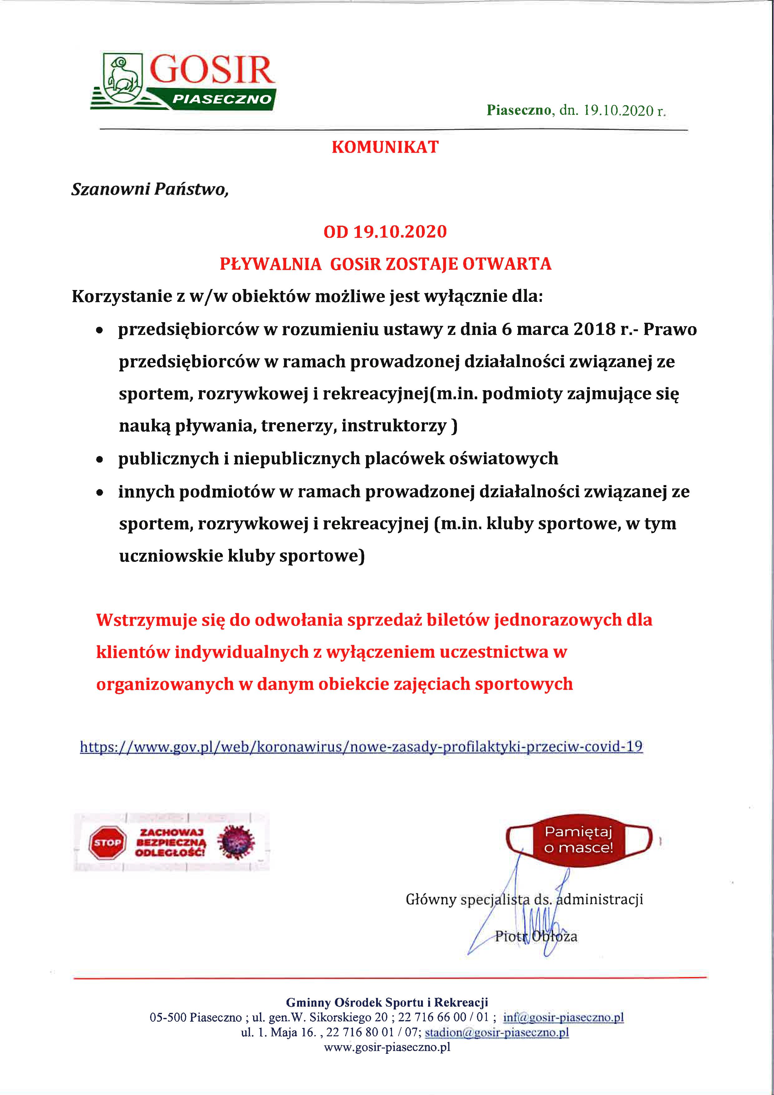 Od 19.10.2020r. PŁYWALNIA GOSiR ZOSTAJE OTWARTA.