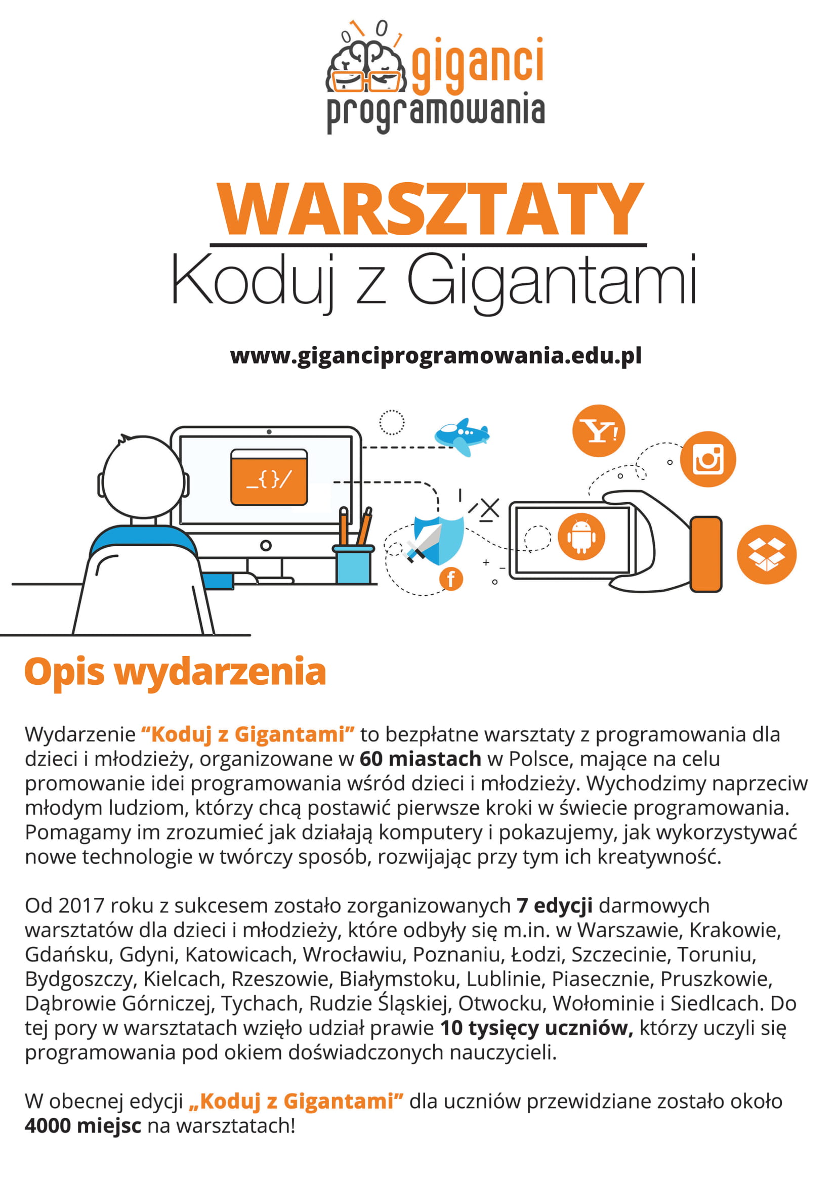 na warsztaty programowania "KODUJ Z GIGANTAMI" dla uczniów szkół podstawowych,