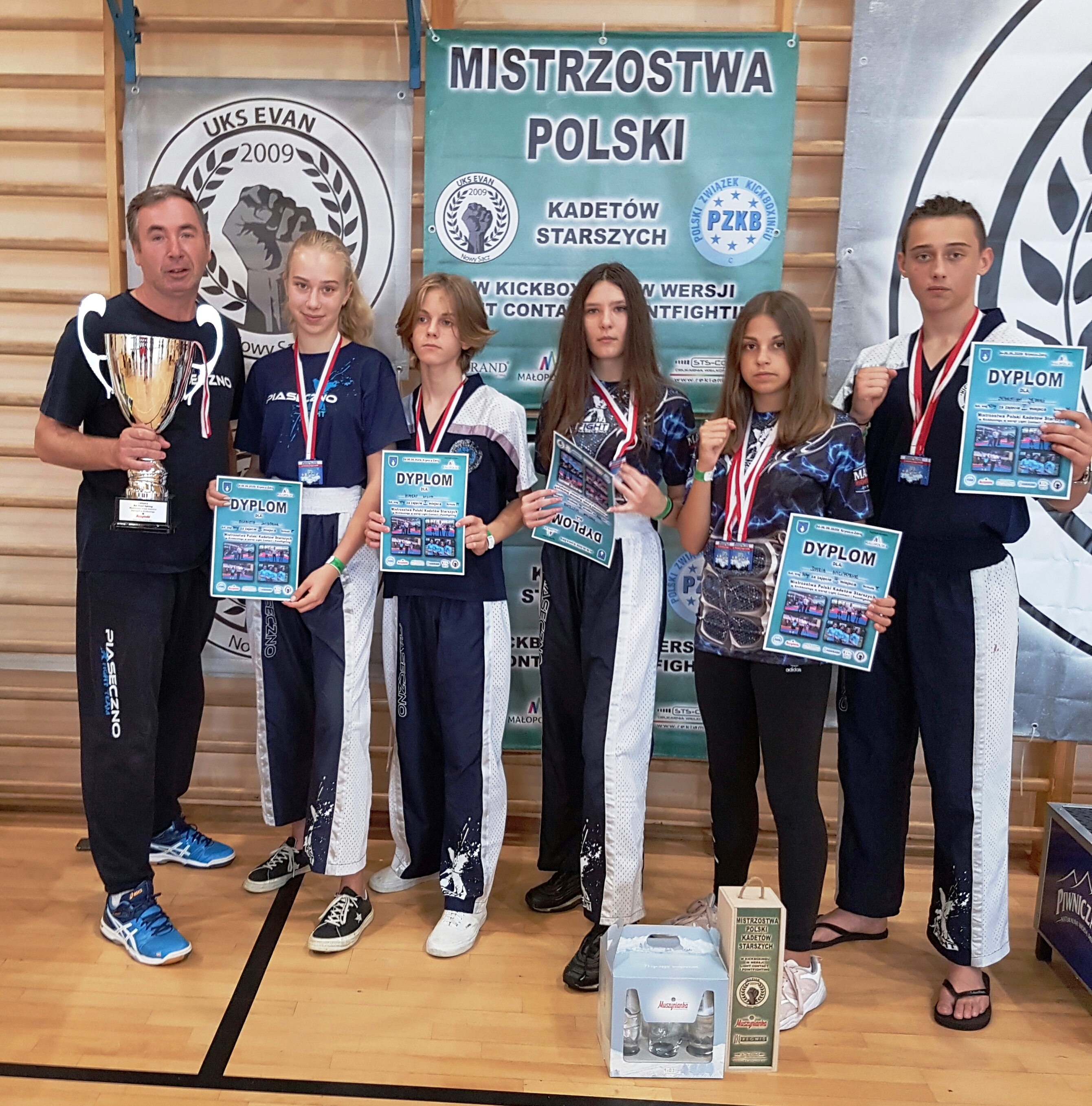 W dniach 4-6 Września 2020r w Krynicy Zdrój odbyły się Mistrzostwa Polski Kadetów Starszych w Kickboxingu w formułach Pointfighting i Light contact. W zawodach wystartowali zawodnicy z 43 klubów. W pierwszym dniu Mistrzostw Kadeci rywalizowali w walce ciągłej na zasadach Light contact. W tej formule nasi zawodnicy zdobyli 3 medale. W kat. -50kg dziewcząt brąz zdobyła Daria Niciporuk a srebro Martyna Wieteska. Najlepiej jednak spisał się Sebastian Jędraś, któremu zabrakło jednego celnego trafienia aby znaleźć się na najwyższym stopniu podium w kategorii wagowej +65kg. Sebastian wywalczył w tej formule srebro. W tym dniu zabrakło naszych fighterom trochę szczęścia żeby znacząco powiększyć dorobek medalowy. Podobno szczęście sprzyja lepszym a takimi byli nasi zawodnicy w drugim dniu Mistrzostw. 5 medali z czego 3 złote pozwoliło naszej drużynie zwyciężyć w klasyfikacji klubowej w formule Pointfighting. Mistrzami Polski zostali: Martyna Wieteska, Hubert Wiluk i Sebastian Jędraś. Brązowe medale zdobyli: Daria Niciporuk i Elżbieta świderska. Cieszy dobra postawa naszych zawodników na najważniejszej imprezie sportowej w tym sezonie.