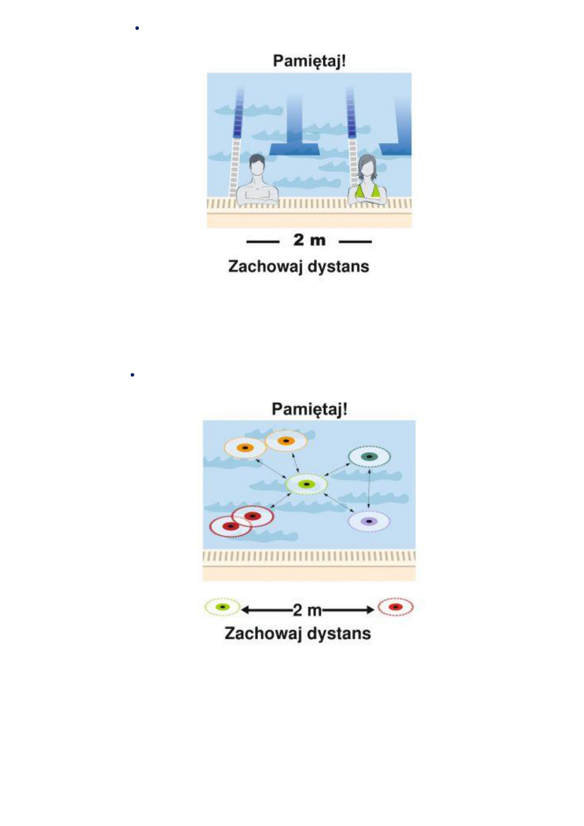 - korzystaj tylko i wyłącznie z wydzielonych pryszniców i kabin, zachowując dystans 2 metrów pomiędzy osobami,