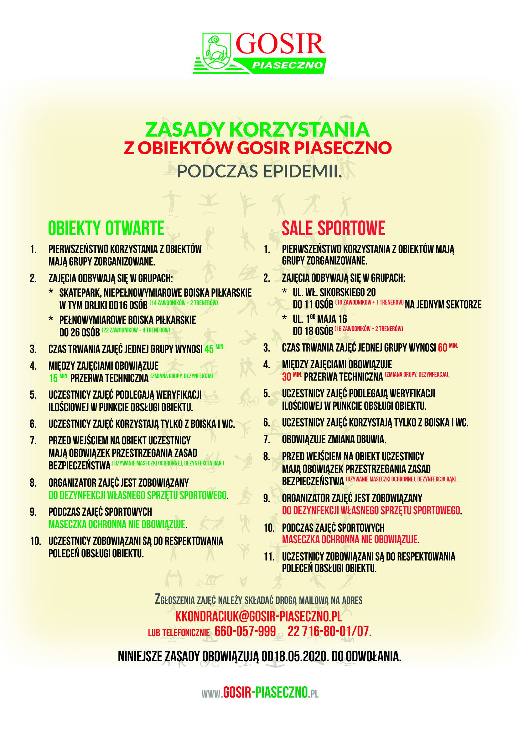 Zasady korzystania z otwartych obiektów GOSiR Piaseczno podczas epidemii.