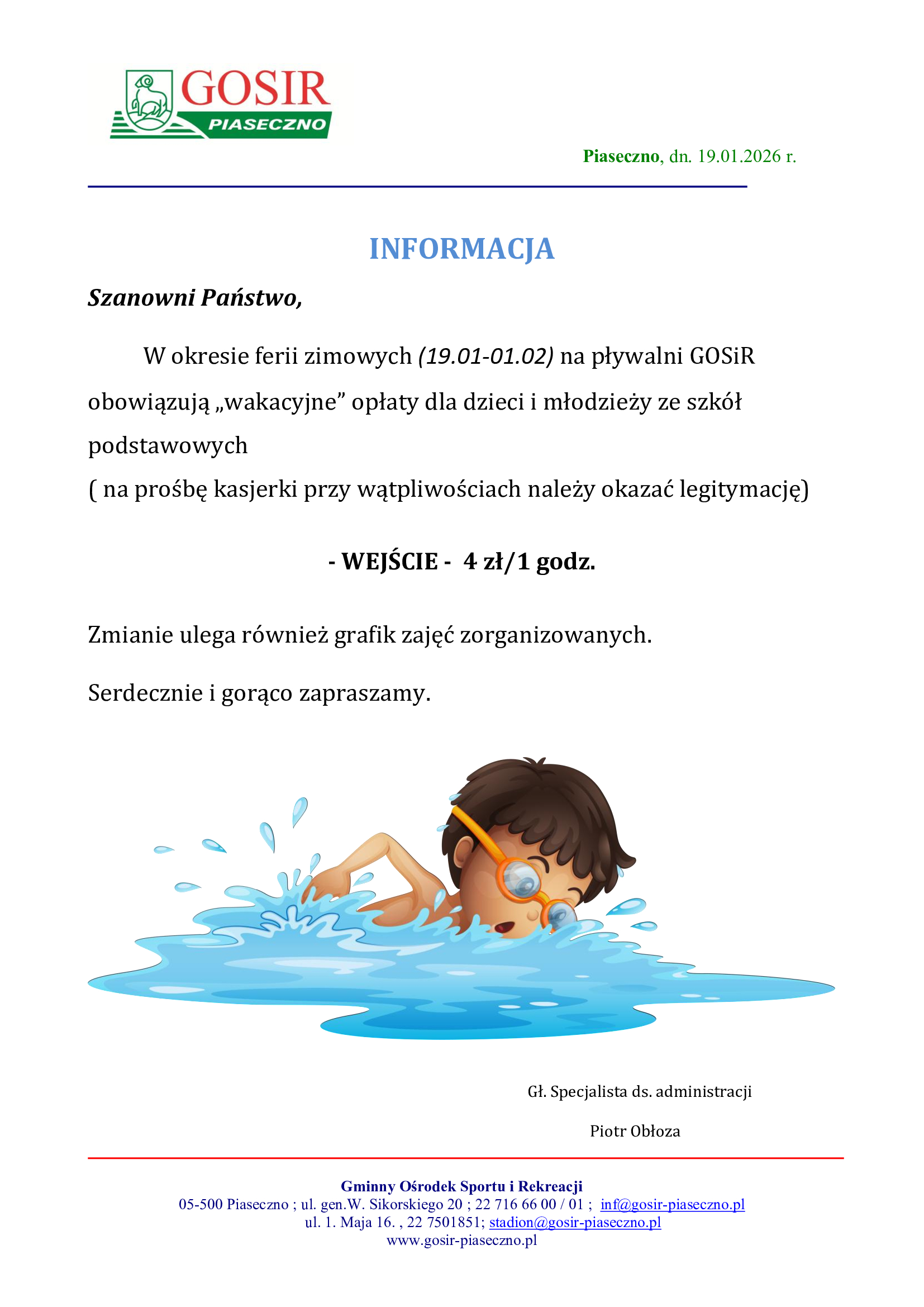 Poniżej przedstawiamy plan zajęć na I turnus (26.01-30.01.2026r.) półkolonii "Sportowa Zima w Mieście 2026".