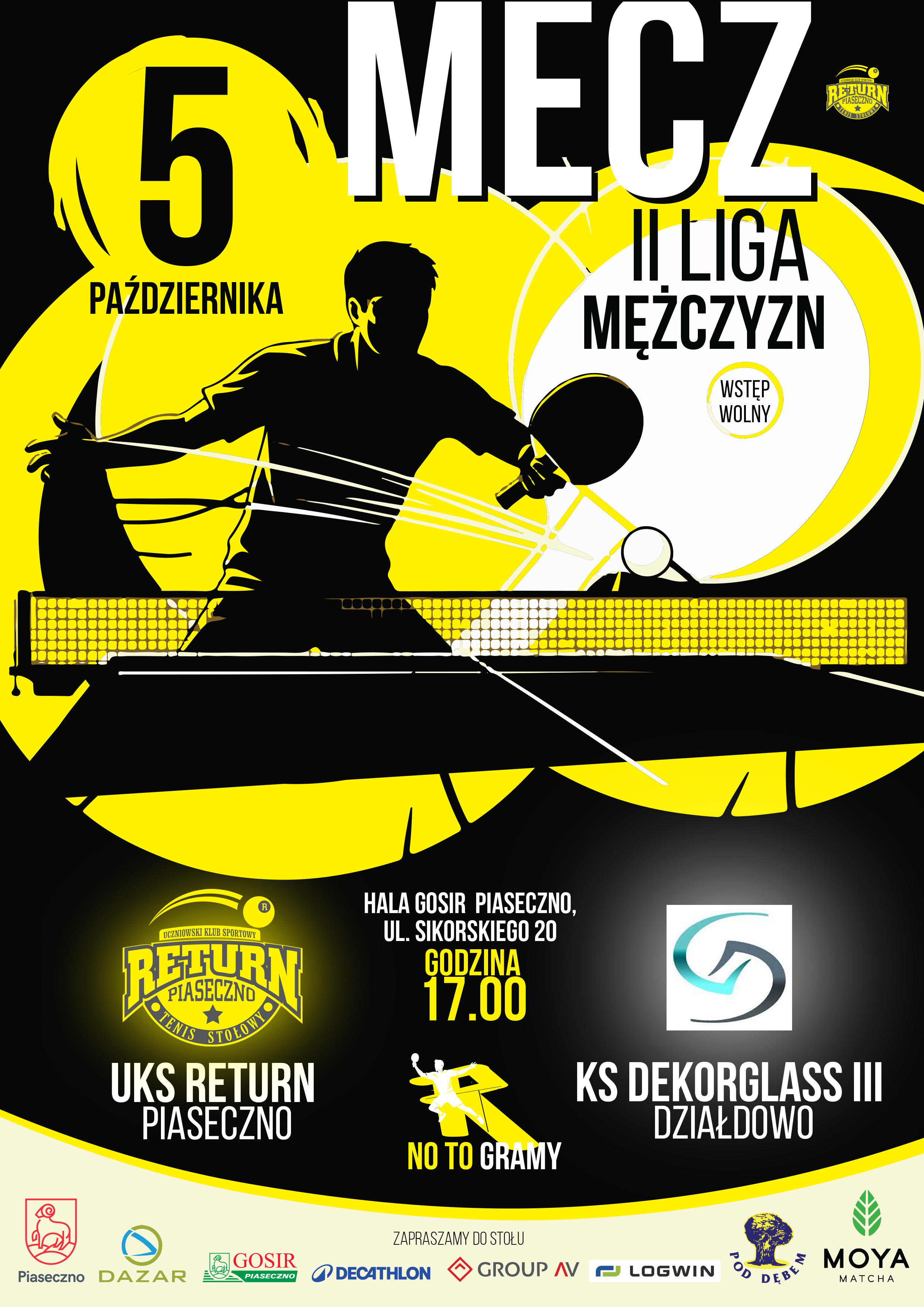 W niedzielę 5 października o godzinie 17:00 tenisiści stołowi UKS Return Piaseczno zainaugurują rozgrywki II ligi mężczyzn w sezonie 2025/2026. Ich rywalem będzie drużyna KS Dekorglass Działdowo. Zapowiada się zacięty mecz pełen wielu widowiskowych wymian.