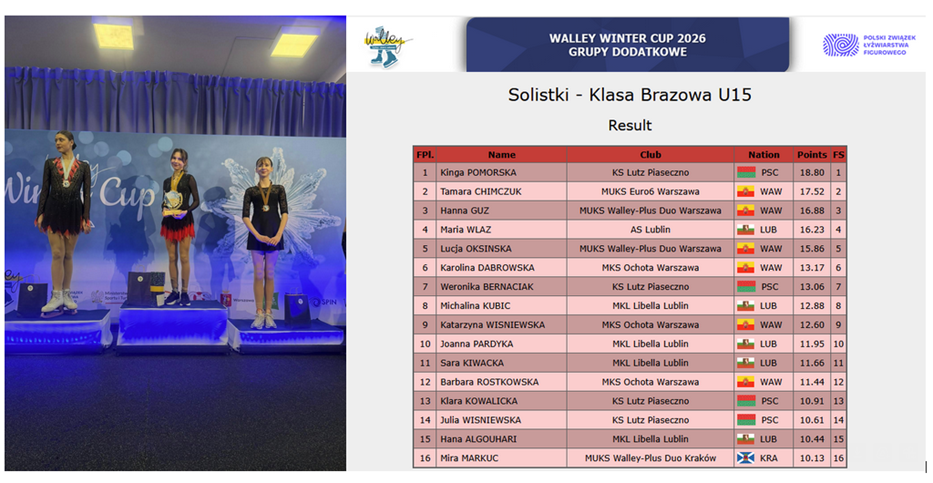 W ubiegłym tygodniu na zawodach Walley Winter Cup po raz pierwszy startowała w wyższej klasie - tzw Klasie Brązowej U15 i zajęła pierwsze miejsce stanowczo zostawiając swoje współzawodniczki za sobą ( duża przewaga punktowa) oraz bijąc znacząco swój rekord życiowy poprzez uzyskanie 18,80 punktów.