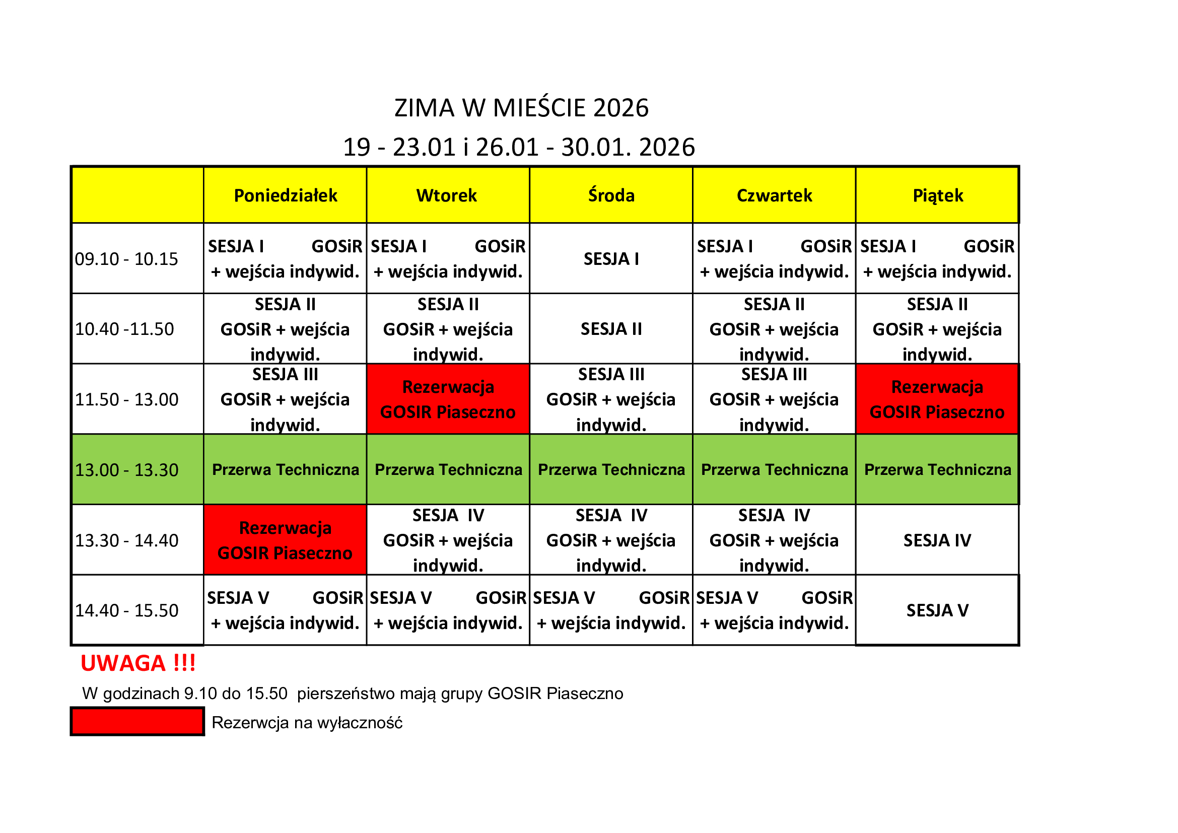 Poniżej zamieszczamy harmonogram pracy Lodowiska w okresie ferii zimowych. Serdecznie zapraszamy.