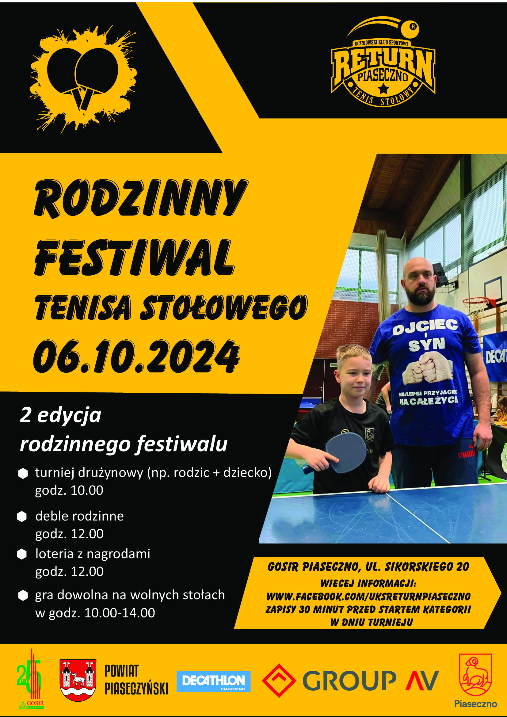 W niedzielę 6 października w sali Gminnego Ośrodka Sportu i Rekreacji odbędzie się Rodzinny Festiwal Tenisa Stołowego. Będzie to świetna okazja do aktywnego spędzenia wolnego czasu w gronie najbliższych. Na uczestników czekają turnieje w dwóch kategoriach: drużyna rodzinna oraz deble rodzinne. Ponadto w trakcie zawodów będą odbywać się konkursy z nagrodami oraz loteria nagród. Drużyny są dwuosobowe – w każdej z nich musi wystąpić przynajmniej jedno dziecko poniżej 18 roku życia.