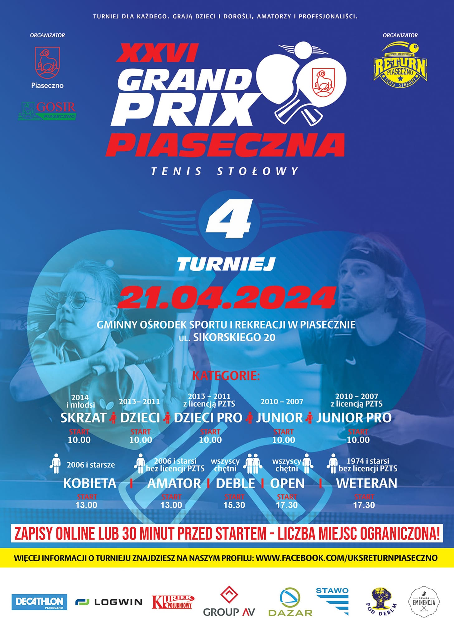 Już w najbliższą niedzielę 21 kwietnia rozegramy czwarty turniej XXVI edycji Grand Prix Piaseczna w tenisie stołowym.