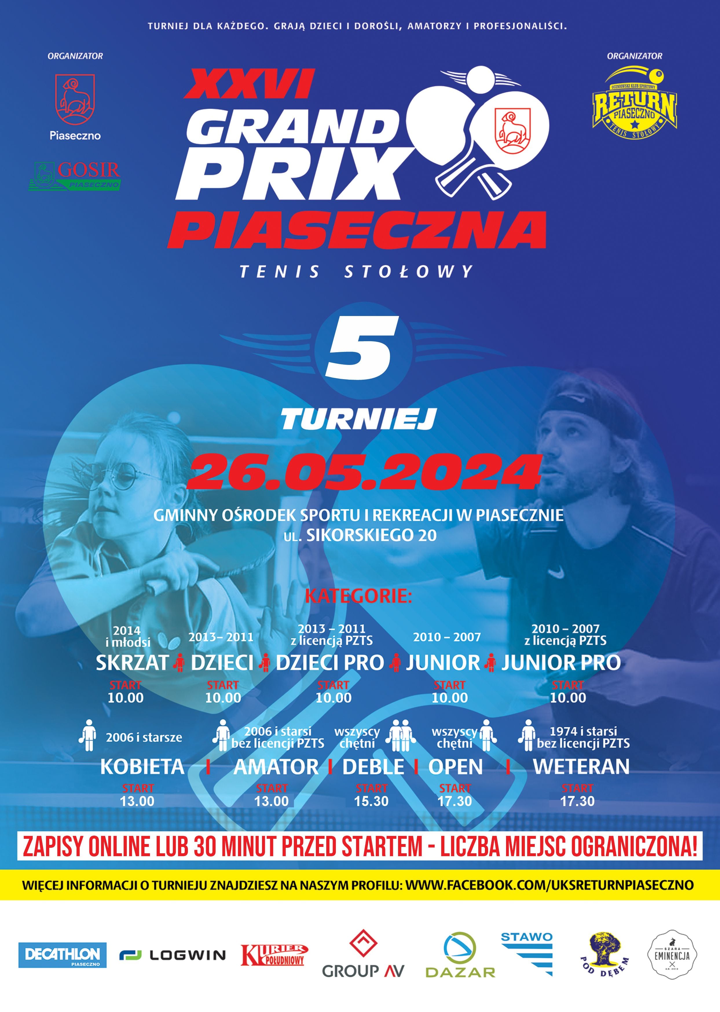 Już w najbliższą niedzielę 26 maja rozegramy piąty turniej XXVI edycji Grand Prix Piaseczna w tenisie stołowym.