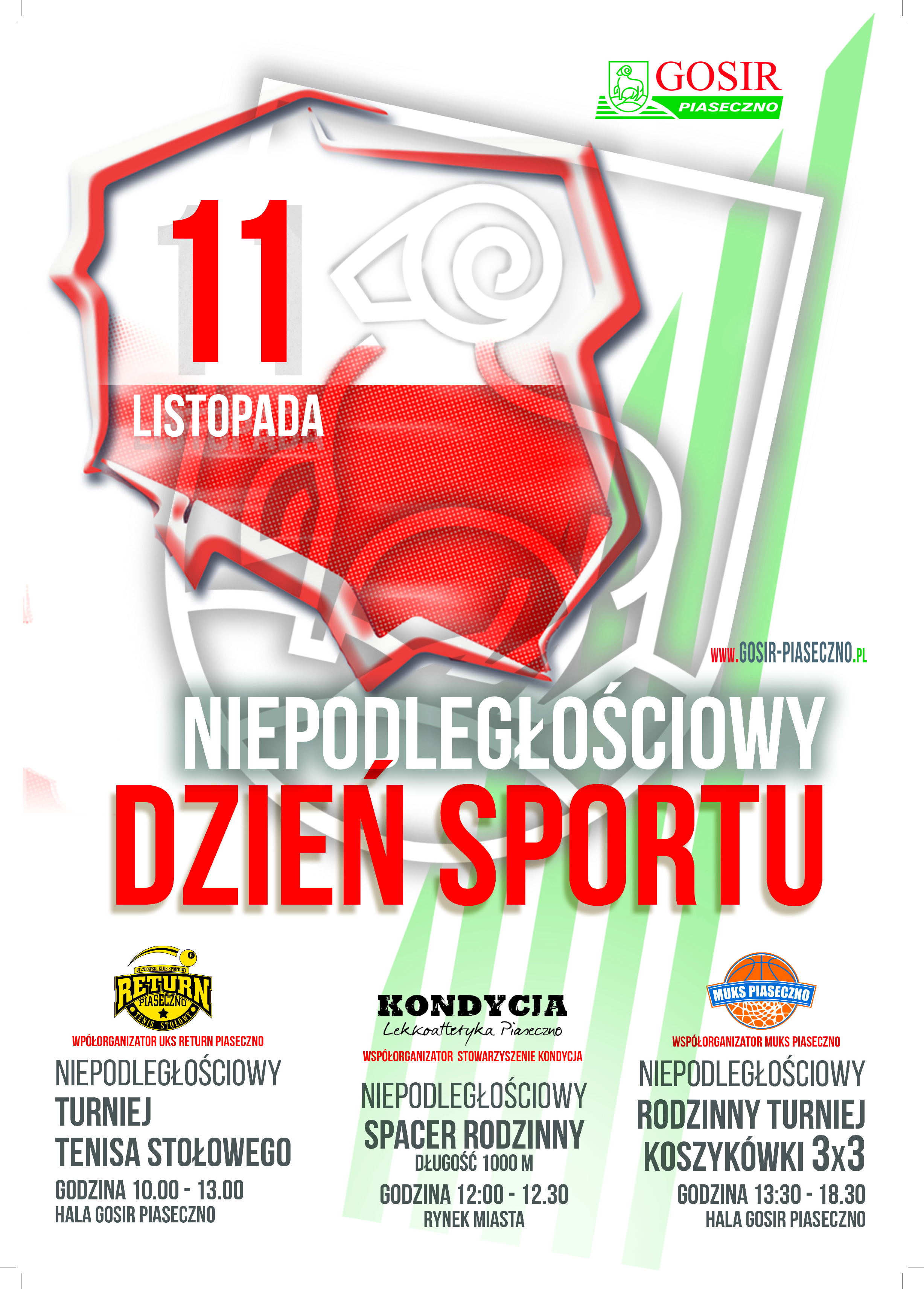 Serdecznie zapraszamy wszystkich mieszkańców do udziału w sportowych imprezach z okazji Dnia Niepodległości. We wtorek 11 listopada w ramach Niepodległościowego Dnia Sportu odbędą się trzy sportowe wydarzenia: