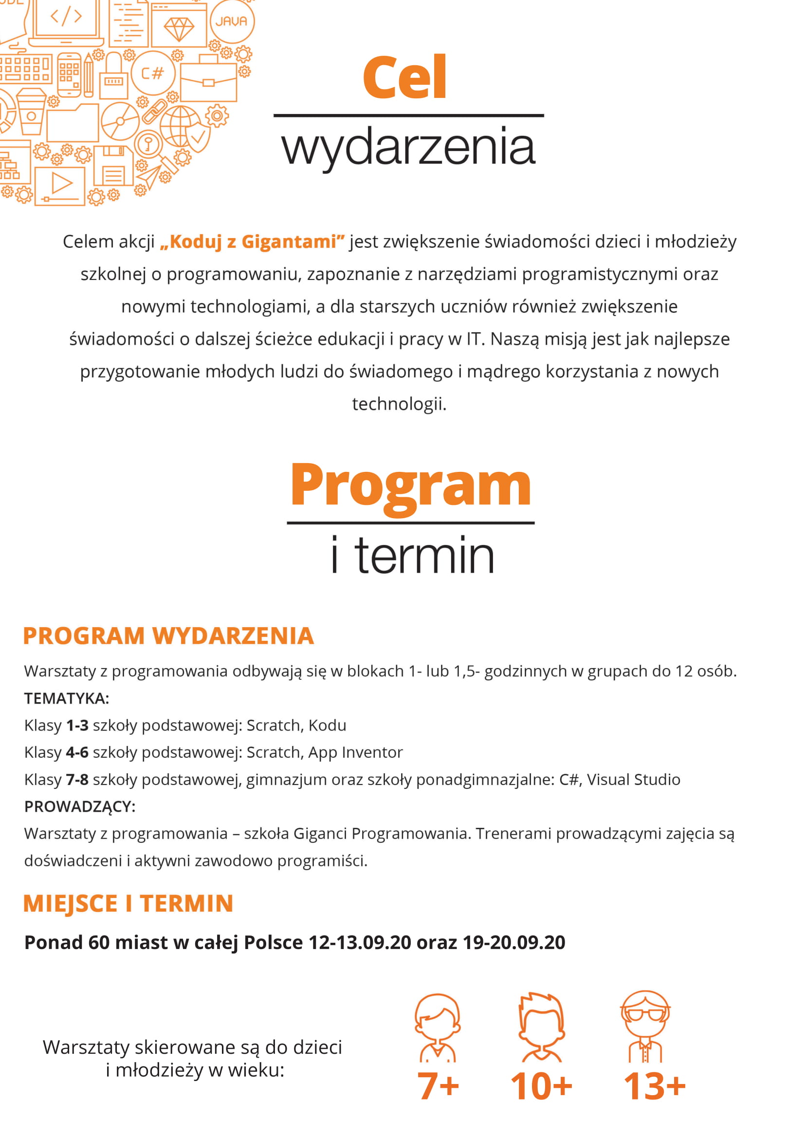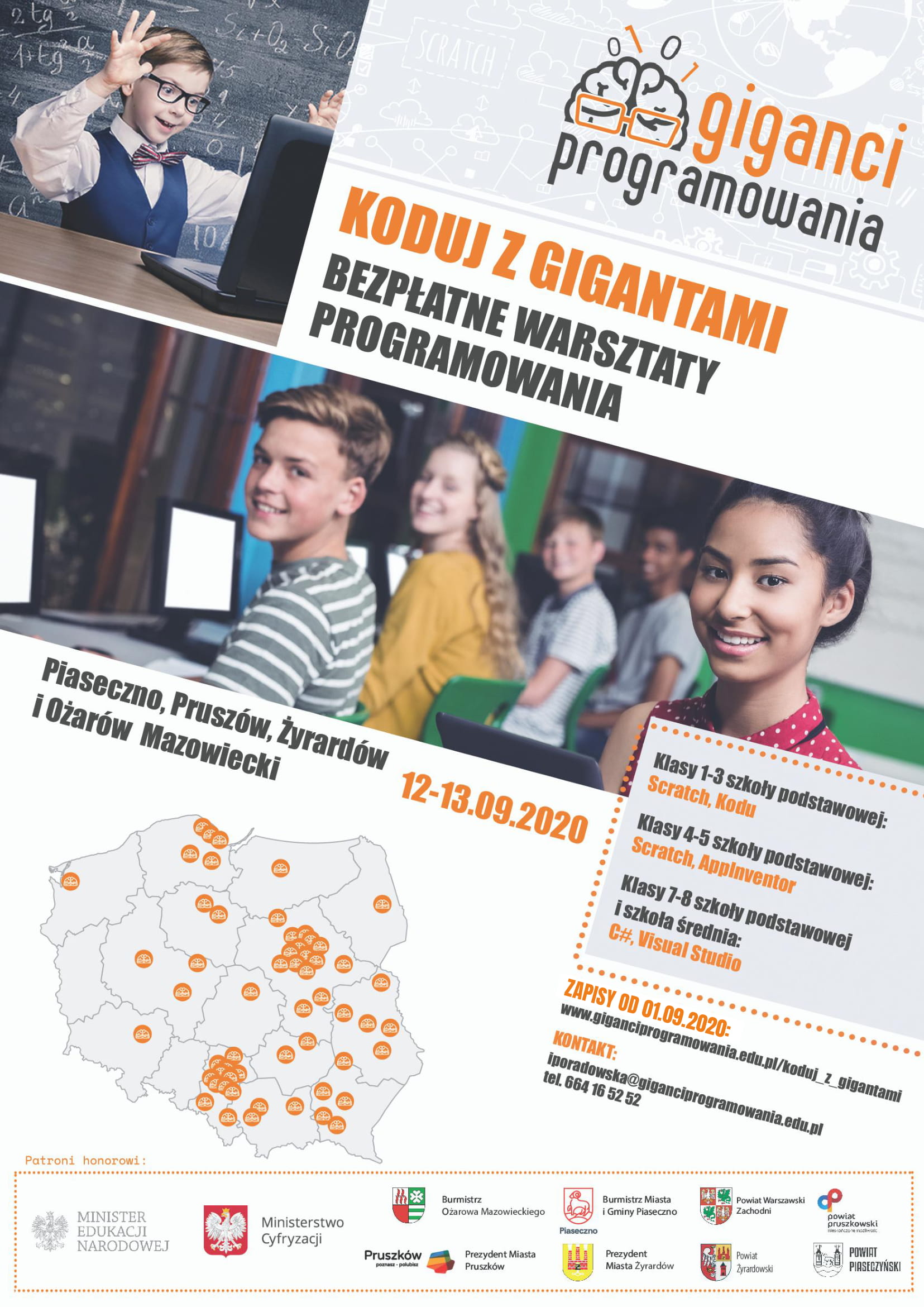 „Koduj z Gigantami” to darmowe warsztaty z nauki programowania dla dzieci i młodzieży, organizowane w całej Polsce pod patronatem Ministra Cyfryzacji oraz Ośrodka Rozwoju Edukacji.