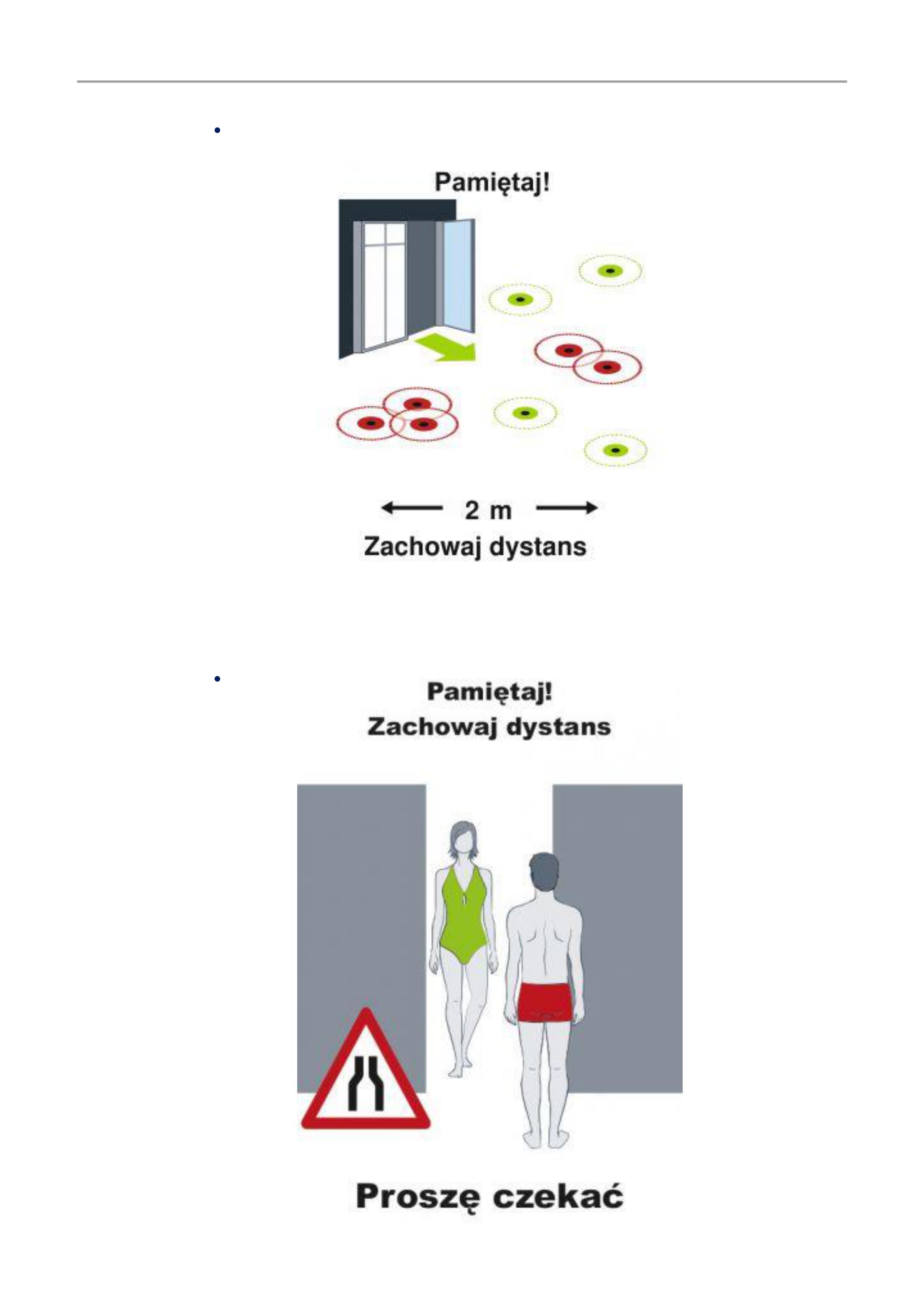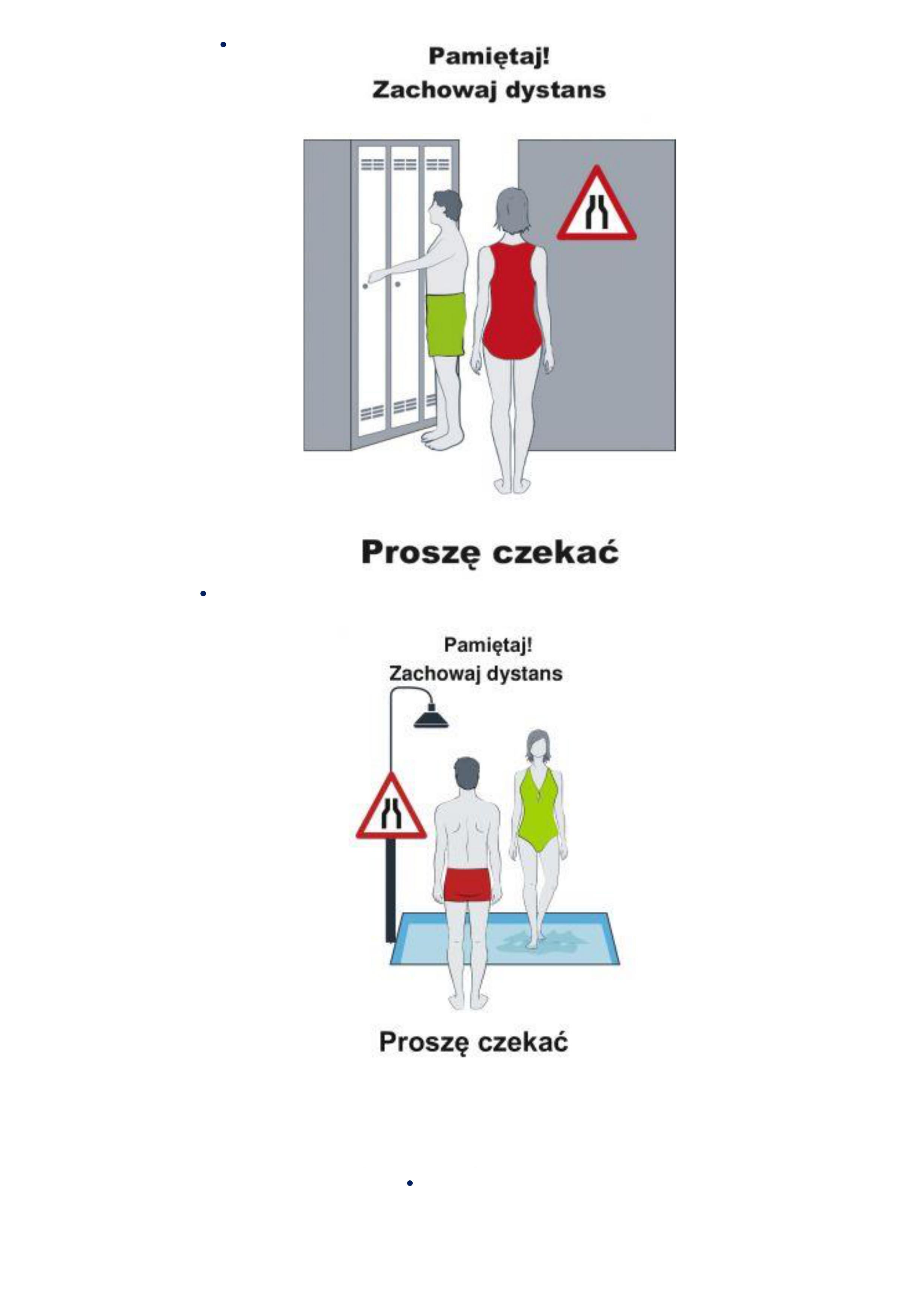 - korzystaj tylko i wyłącznie z wydzielonych pryszniców i kabin, zachowując dystans 2 metrów pomiędzy osobami,