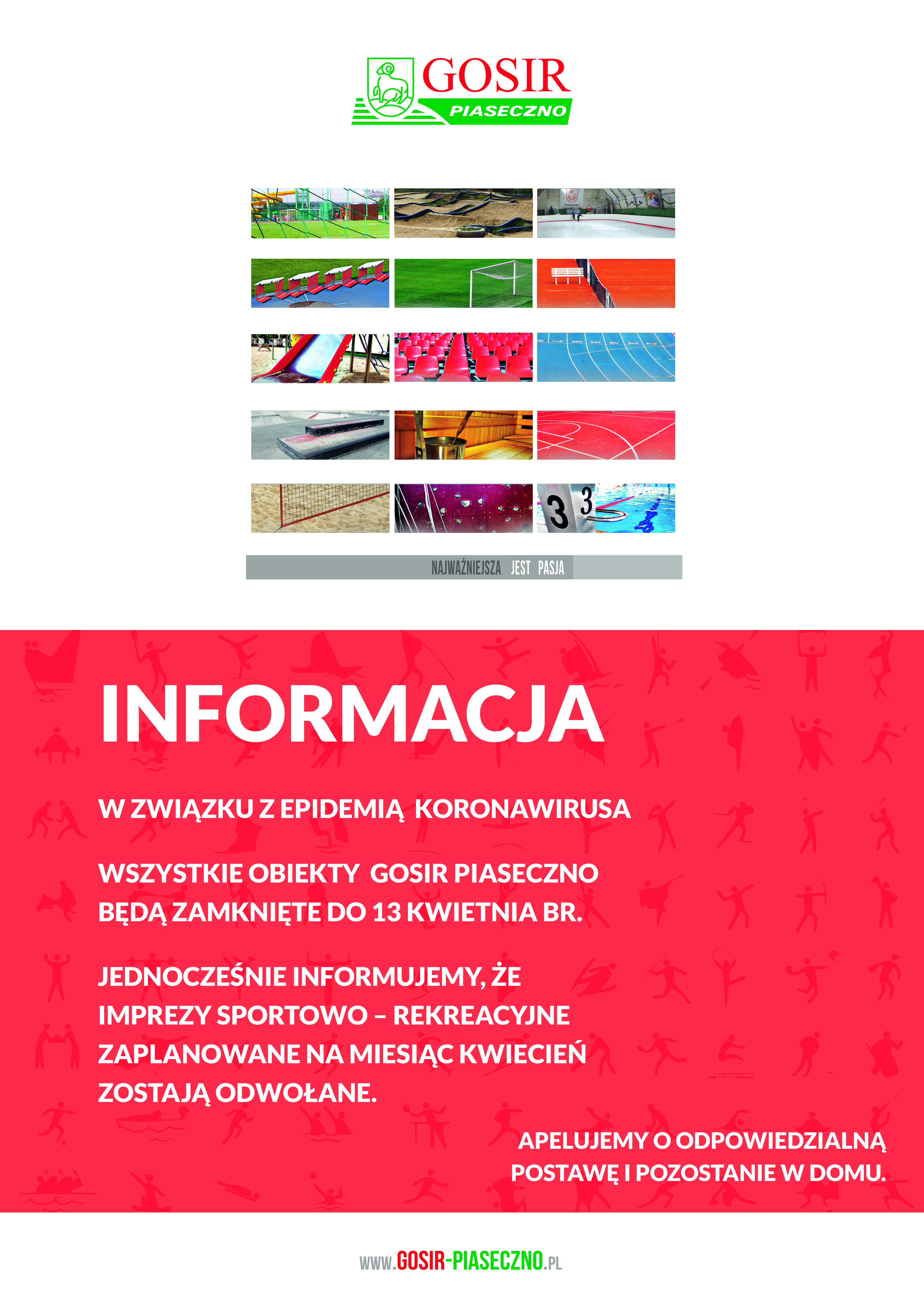 że od 18 maja br. wszystkie obiekty GOSiR Piaseczno z wyjątkiem pływalni