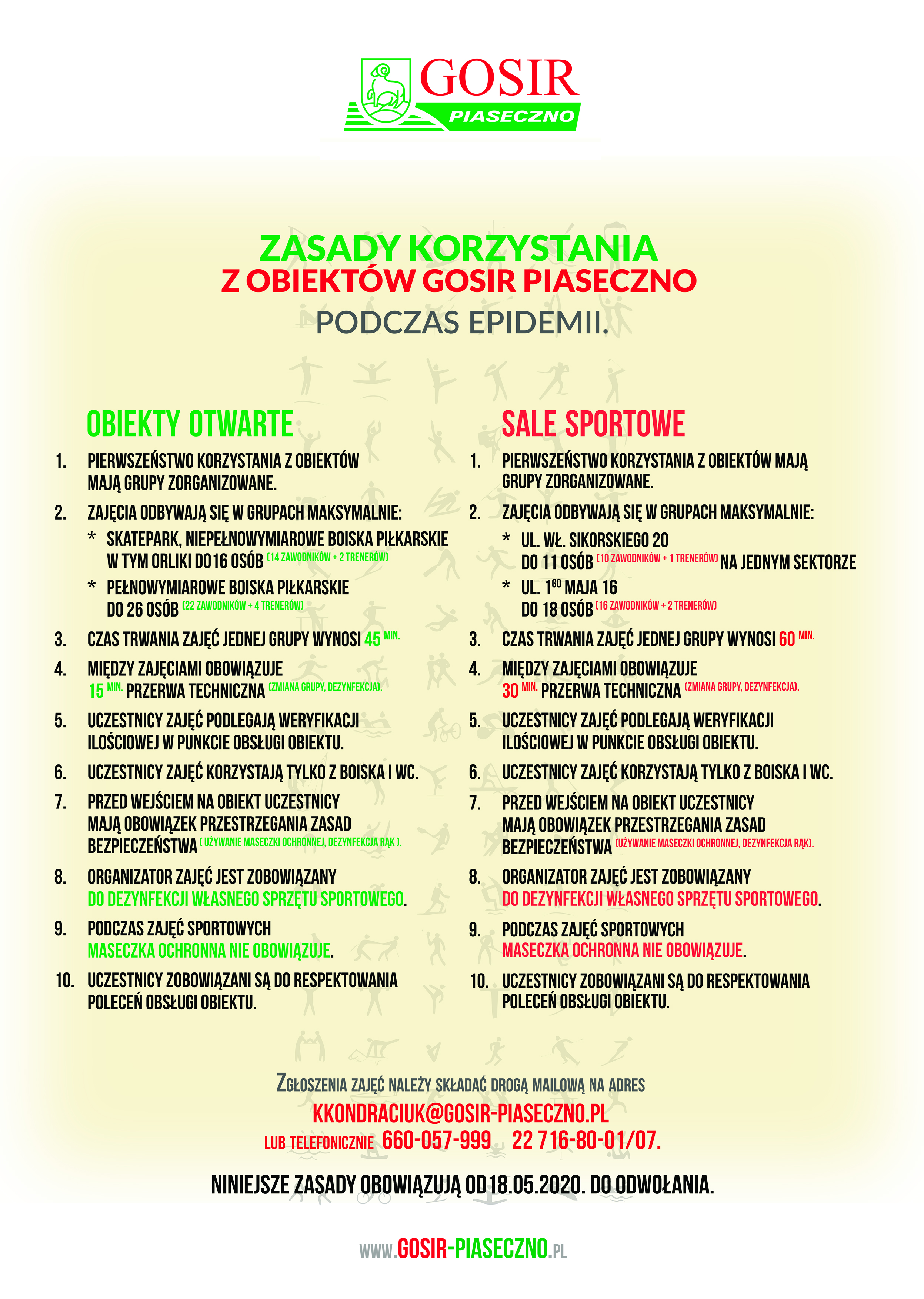 Zasady korzystania z otwartych obiektów GOSiR Piaseczno podczas epidemii.