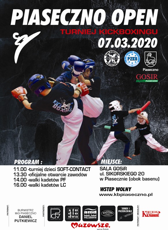 Zapraszamy na kolejną VIII edycję ogólnopolskiego turnieju kadetów i dzieci w Kickboxingu „ Piaseczno Open”. Zawody odbędą się 7 Marca br. (sobota) w hali GOSiR przy ul. Sikorskiego 20 w Piasecznie. Najmłodsi rywalizować będą w formule Soft contact, która przypomina szermierkę z użyciem pałek piankowych. Starsze dzieci (8-9lat) oraz Kadeci (10-13) skrzyżują rękawice w formule Pointfigting. Kadeci starsi (14-16) walczyć będą o miejsce na podium w formułach Pointfighting i Light contact. Wśród startujących zobaczymy aktualnych Mistrzów Polski i reprezentantów Polski w tych formułach. Patronat nad imprezą objął burmistrz MiG Piaseczno –Daniel Putkiewicz. Zapraszamy do kibicowania naszym zawodnikom. Poniżej szczegółowy program: